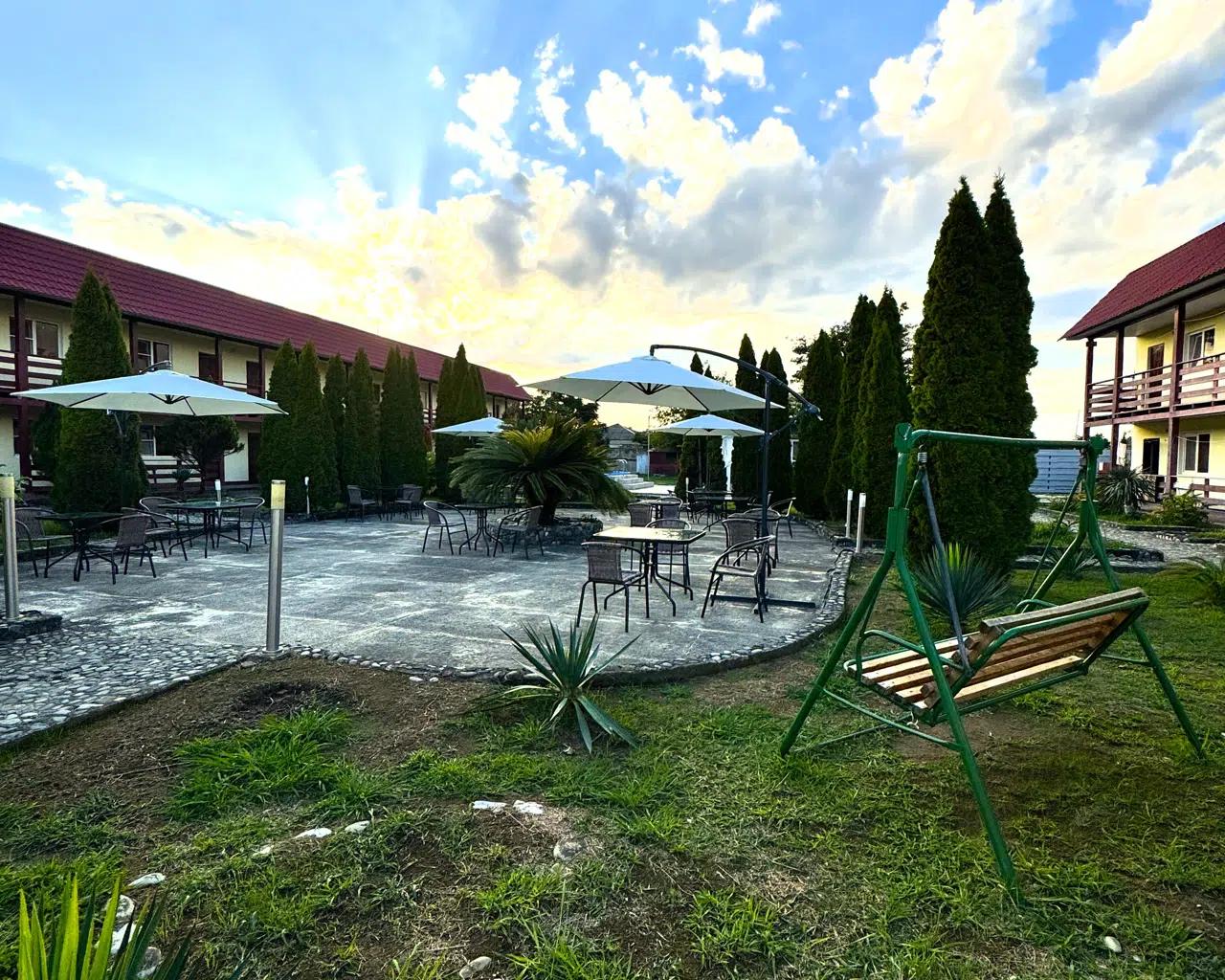 «Абхазский дворик» расположен на закрытой уютной территории с газонами и клумбами, уютными мощеными дорожками, ярко-зелеными южными деревцами. Здесь можно хорошо отдохнуть в уединенной комфортной обстановке. Посреди гостиничного двора расположено летнее кафе, а рядом с ним бассейн под открытым небом. Также в корпусе есть кафе-столовая.